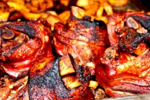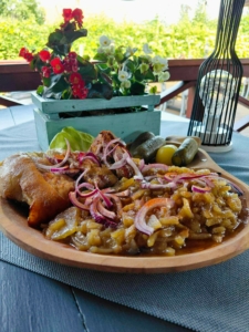 - Főétel: Kemencében, szőlővenyige parázson készült sült oldalas és sült csülök hagymás törtburgonyával és kovászos uborkával